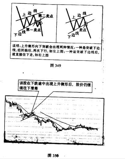 不过这种回落较为轻微而缓和,因而股价在未跌到上次低点之前已得到支撑而上升,并且越 过上次高点,形成一浪高于一浪的趋势。第二次的上升止于另一 两点之后,股价再度回落。我们把两个高点和两个低点分别用直 线连起来.就形成了一个上倾的楔形,这就是上升楔形(见图349)。