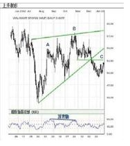 上图是一个上升楔形的例子,价格于七月中由一个跌市开始慢慢下跌,在A点和B点相符的新低,分别形成新高。但相对强弱指数(RSI)显示,由A点至B点间的升幅却出现了顶背驰。当下斜线与价格相遇,上涨趋势没有足够的动力使价格推上,价格随即跌穿支持线C点,下跌趋势因此而持续。