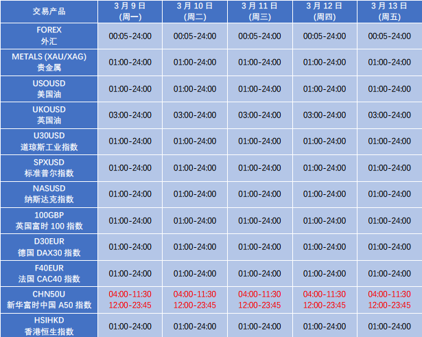 自2020年3月9日起,美国与部分欧洲国家进入夏令时,受此影响,部分交易品种的交易时间出现调整,更新后的交易时间请参考下表。 *表格内红字部分为调整后的交易时间。