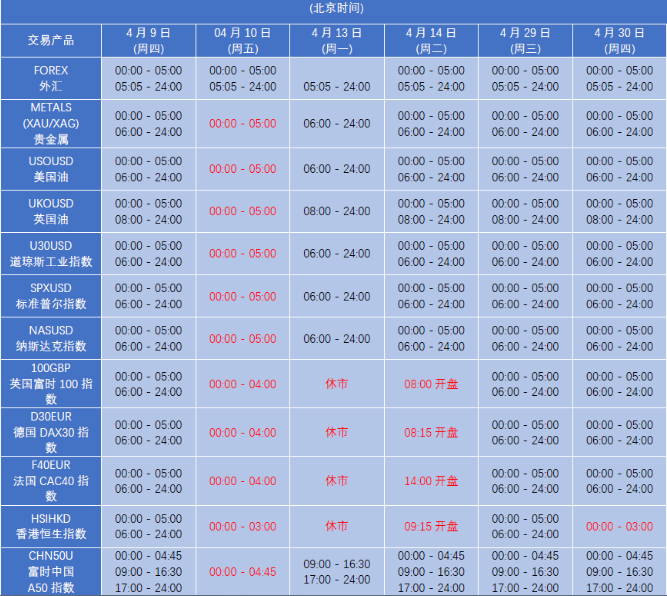 2020年4月9日为美国复活节假期,4月30日为香港佛诞日,届时部分产品的交易时间段将出现变动,具体情况请参考下方表格。请注意,红色部分为变动后的交易时间安排。 若您有任何疑问请及时和我们的客服取得联系,我们将一如既往的竭诚为您服务。